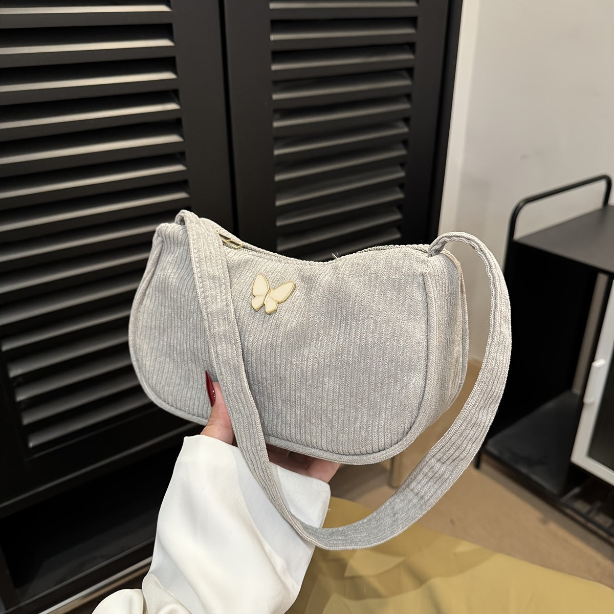 The Corduroy Shoulder Bag was inspired by my love for timeless details and the charm of nature. Each butterfly clasp reminds me that beauty often lies in the smallest touches. Every piece is carefully inspected to ensure it reflects my commitment to elegance and character. May this bag bring a bit of magic to your everyday moments.